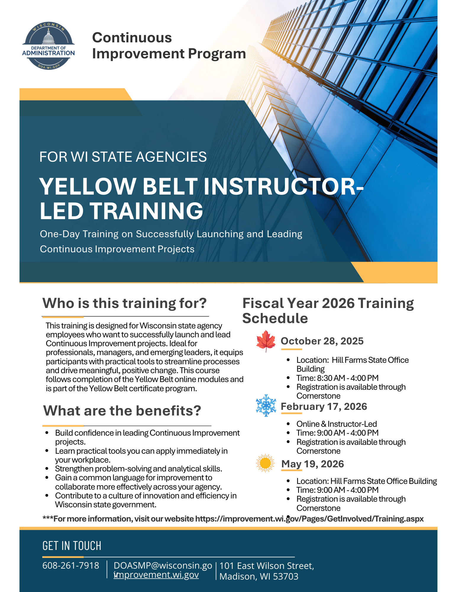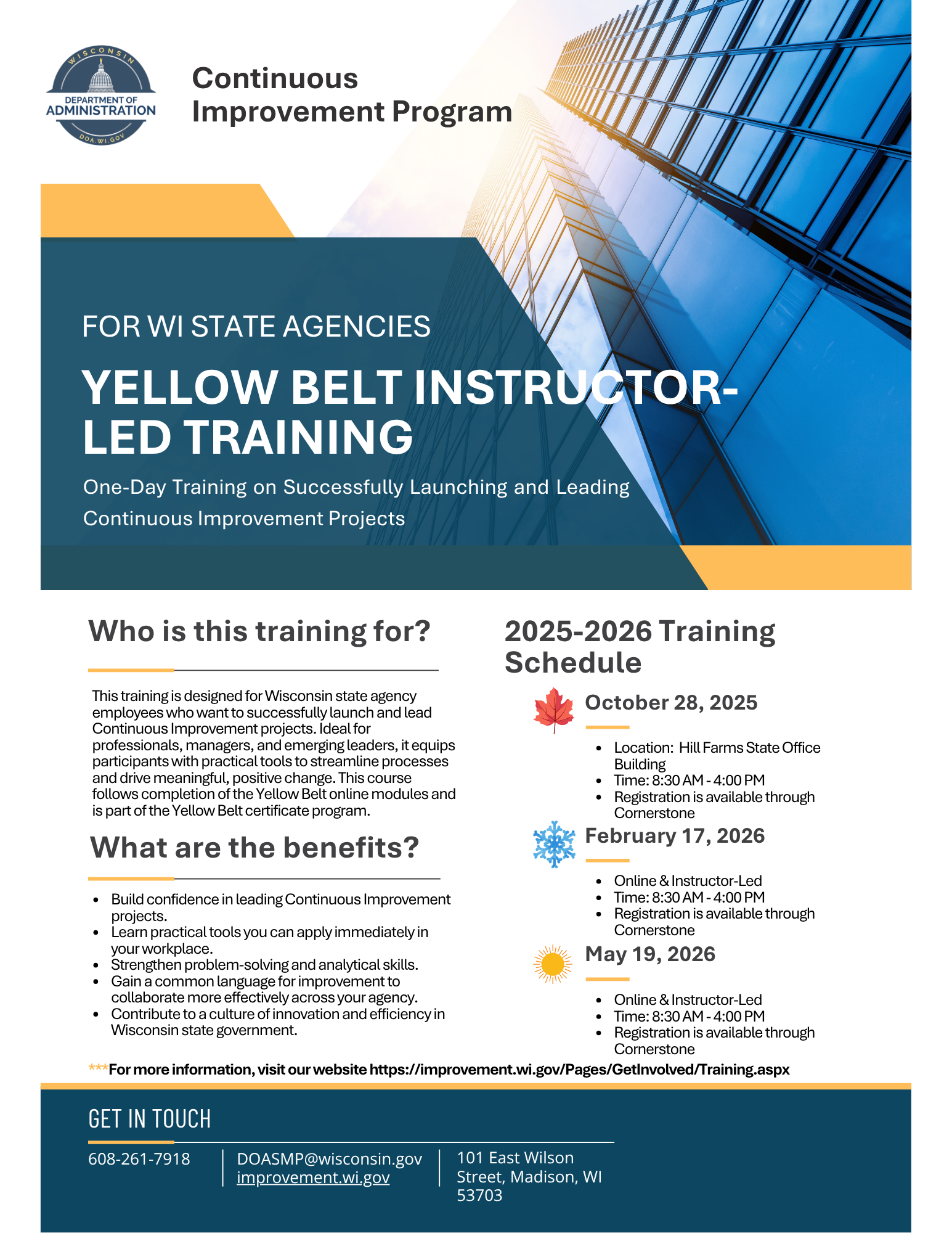 1. Contact your agency's continuous improvement contact, letting them know you're interested in the Yellow Belt certificate 2. Complete the Yellow Belt modules in Cornerstone (modules 1-7) - Start these at least 1 month before the instructor-led training 3. Attend the Yellow Belt Instructor-Led training (8 hours)